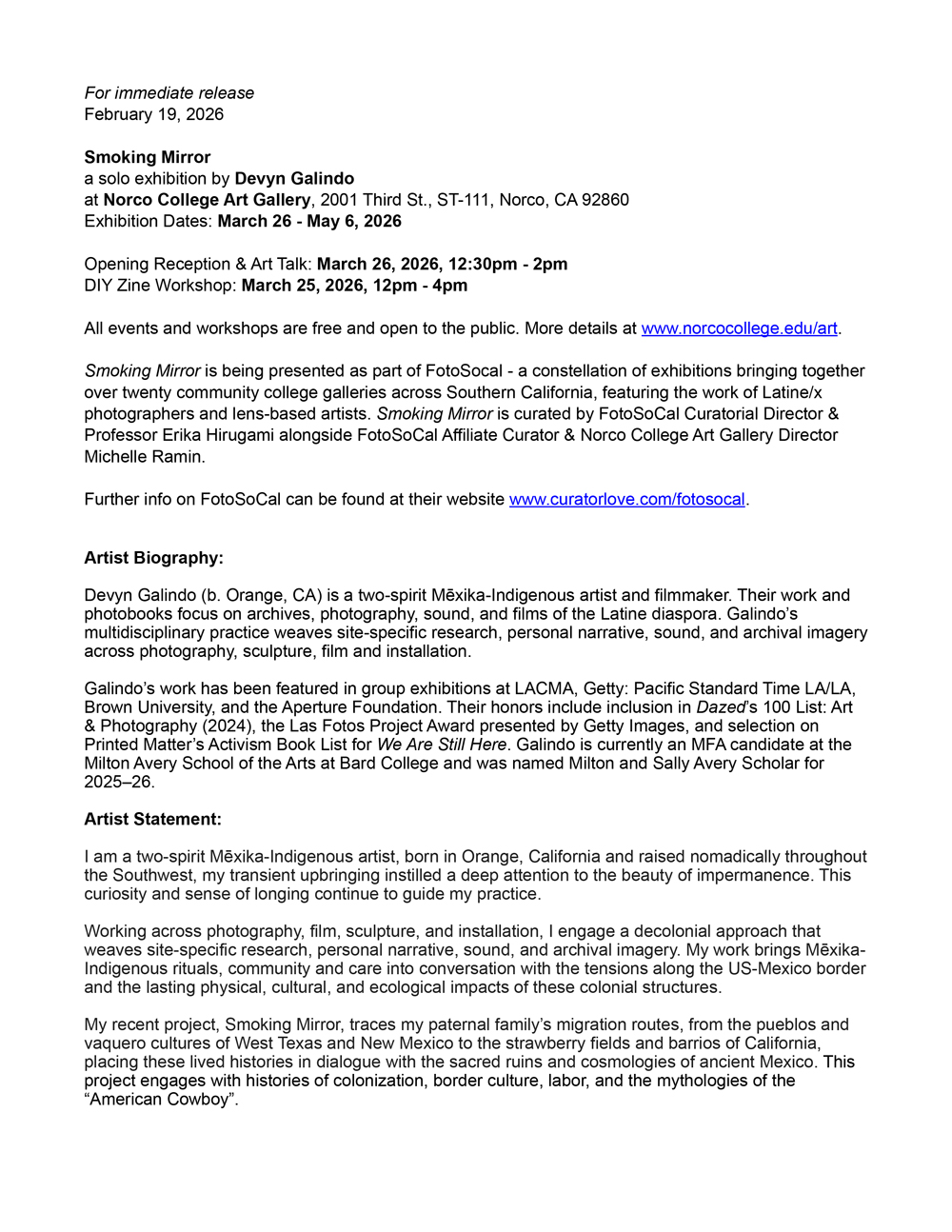 Smoking Mirror is being presented as part of FotoSocal - a constellation of exhibitions bringing together over twenty community college galleries across Southern California, featuring the work of Latine/x photographers and lens-based artists. Smoking Mirror is curated by FotoSoCal Curatorial Director & Professor Erika Hirugami alongside FotoSoCal Affiliate Curator & Norco College Art Gallery Director Michelle Ramin.