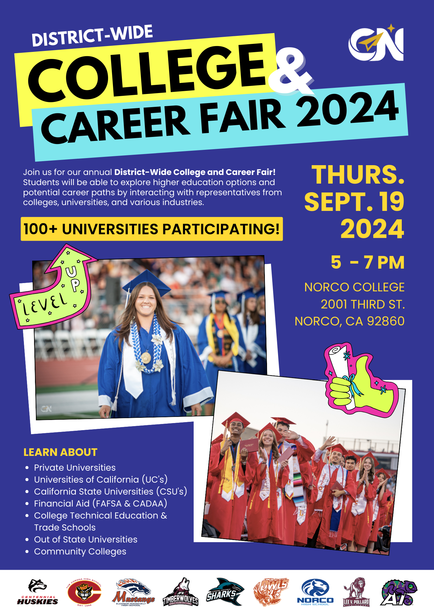Norco College, in collaboration with the Corona-Norco Unified School District (CNUSD), is excited to announce a highly anticipated Career and Education Fair on Thursday, September 19, 2024, from 5- 7 p.m. This event will bring together more than 60 representatives from public and private universities, military branches, emergency services, and local employers to provide students and community members with valuable opportunities for future education and career growth.