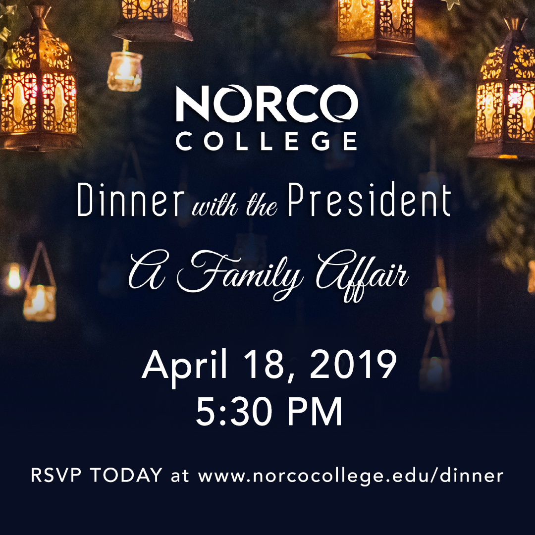 Norco College President, Bryan Reece is hosting Dinner with the President, A family Affair on Thursday, April 18 at 5:30 pm in the Norco College Amphitheater. The evening will consist of recognition, entertainment, unity and celebration under the stars. Cowboy West Productions will be catering the barbecue style food and Galleano Winery and Wicks Brewing will be serving libations.