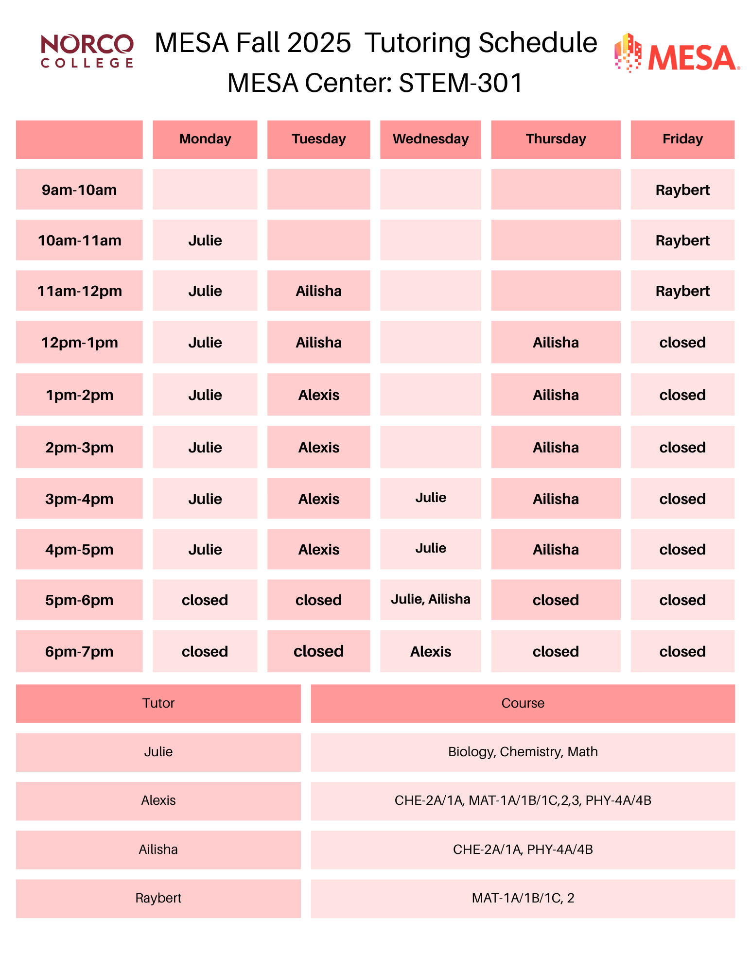 All MESA tutoring is held in-person in the MESA Center (STEM 301). Fall tutoring hours are: