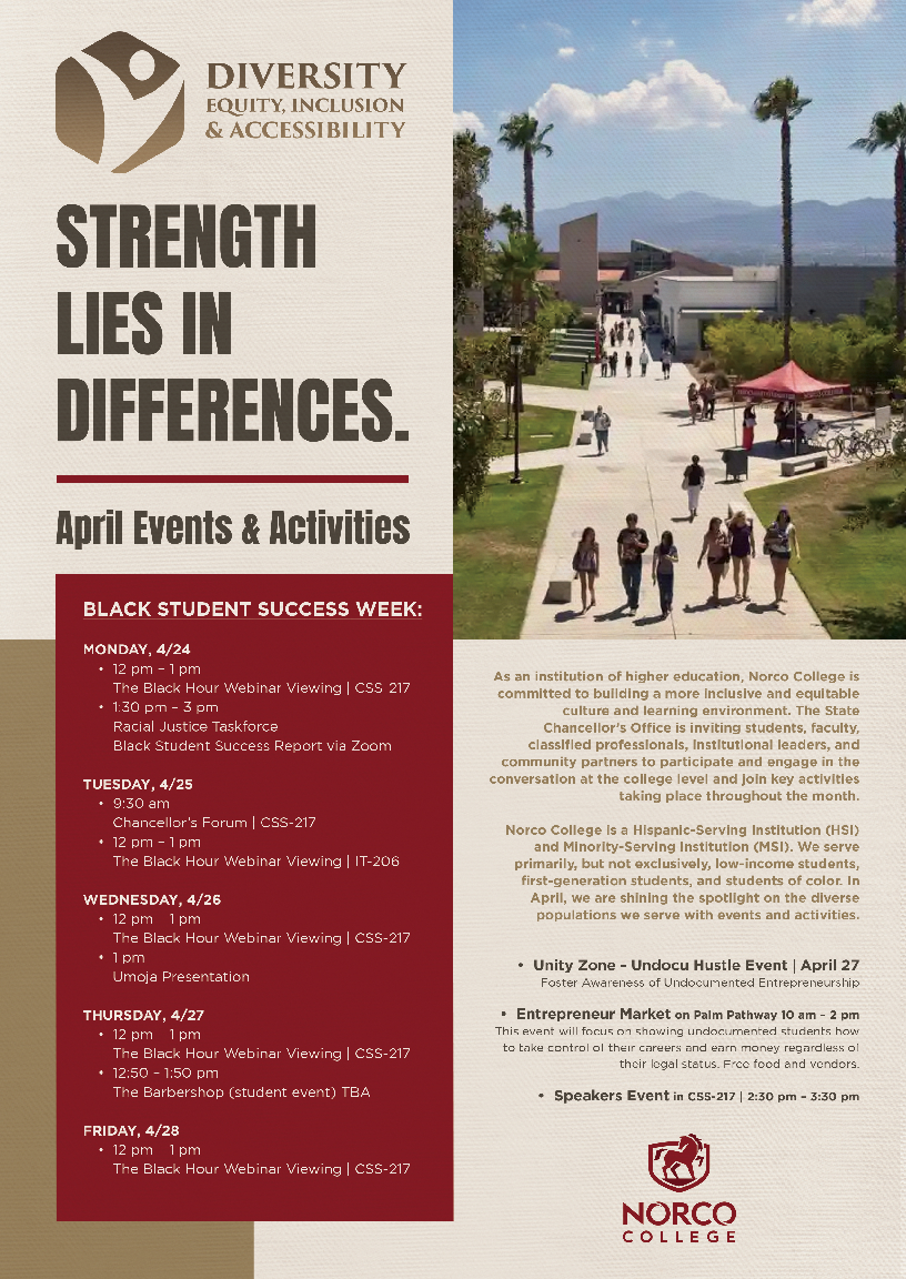 As an institution of higher education, Norco College is committed to building a more inclusive and equitable culture and learning environment. The State Chancellor's Office is inviting students, faculty, classified professionals, institutional leaders, and community partners to participate and engage in the conversation at the college level and join key activities taking place throughout the month.